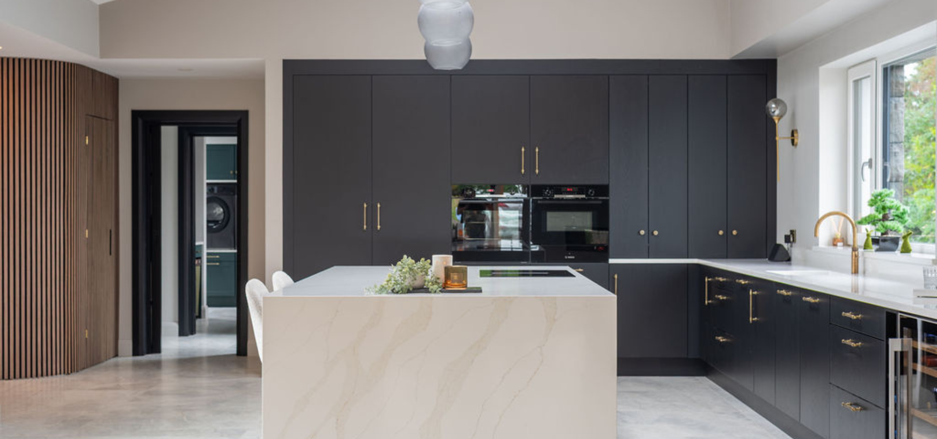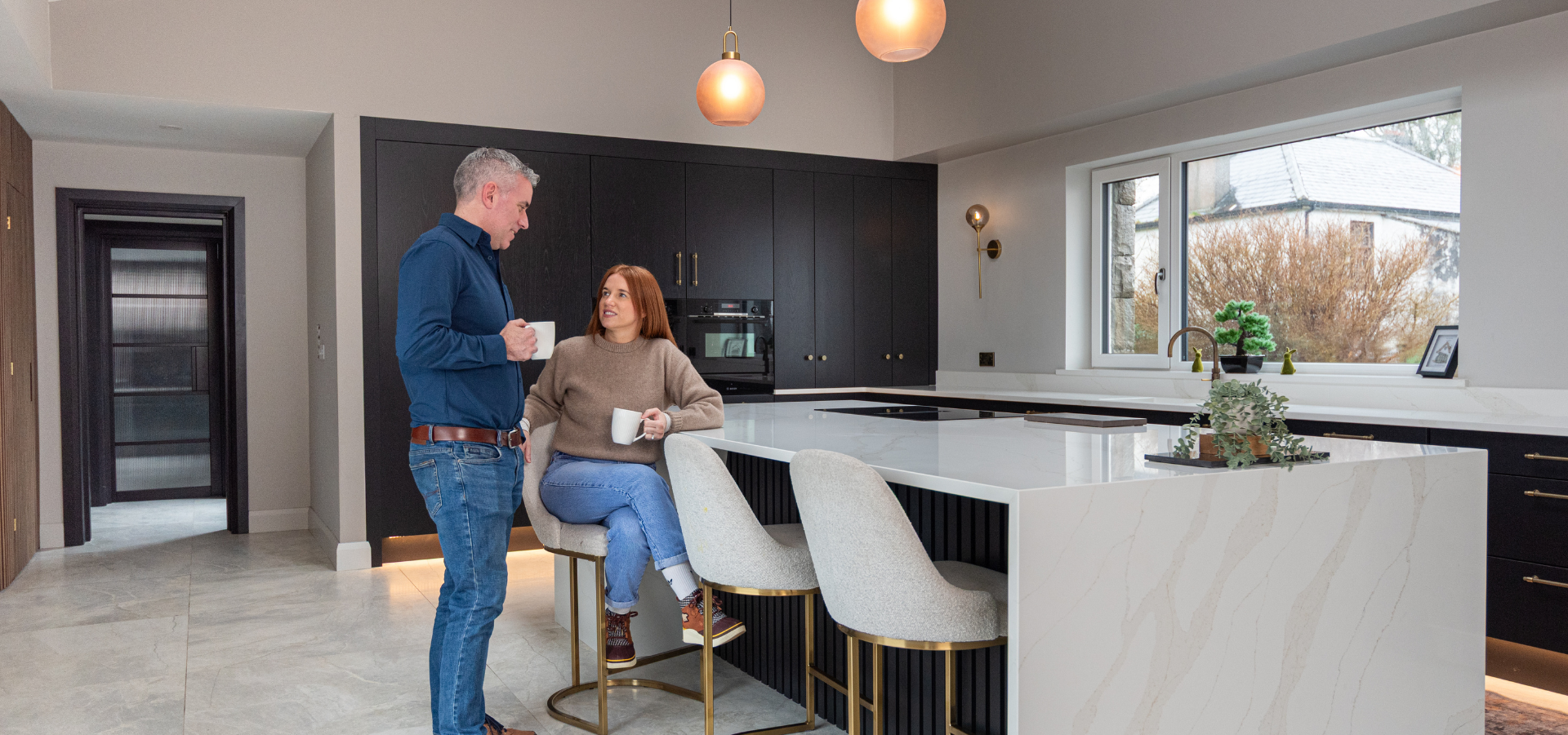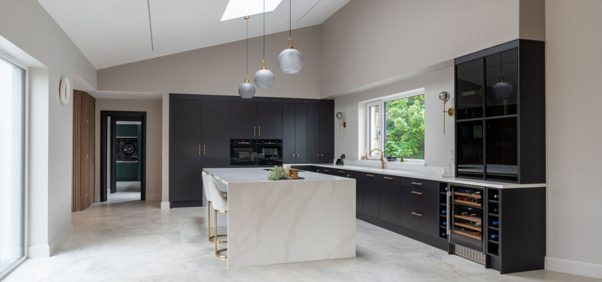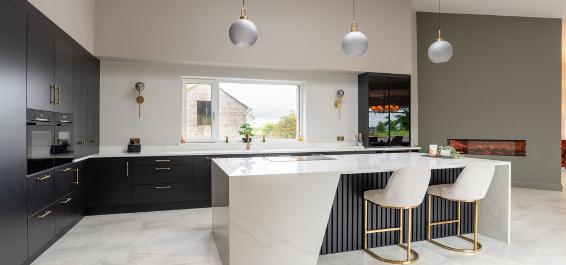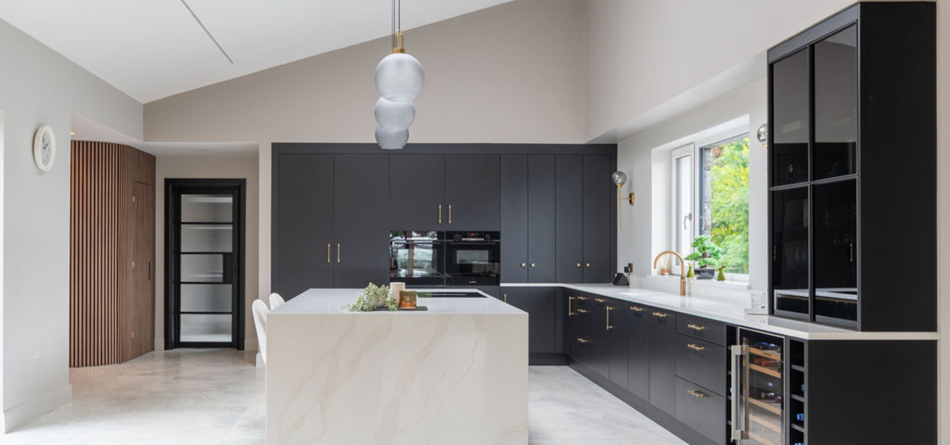 For this new build in County Mayo, Alan and Zara set out to create a bespoke contemporary kitchen that is striking, practical, and effortlessly clutter-free. Designed as the focal point of a large open-plan space, the kitchen combines a bold black palette with clean lines, integrated storage, and high-performance appliances – creating a layout that works effortlessly while keeping the space calm and organised.