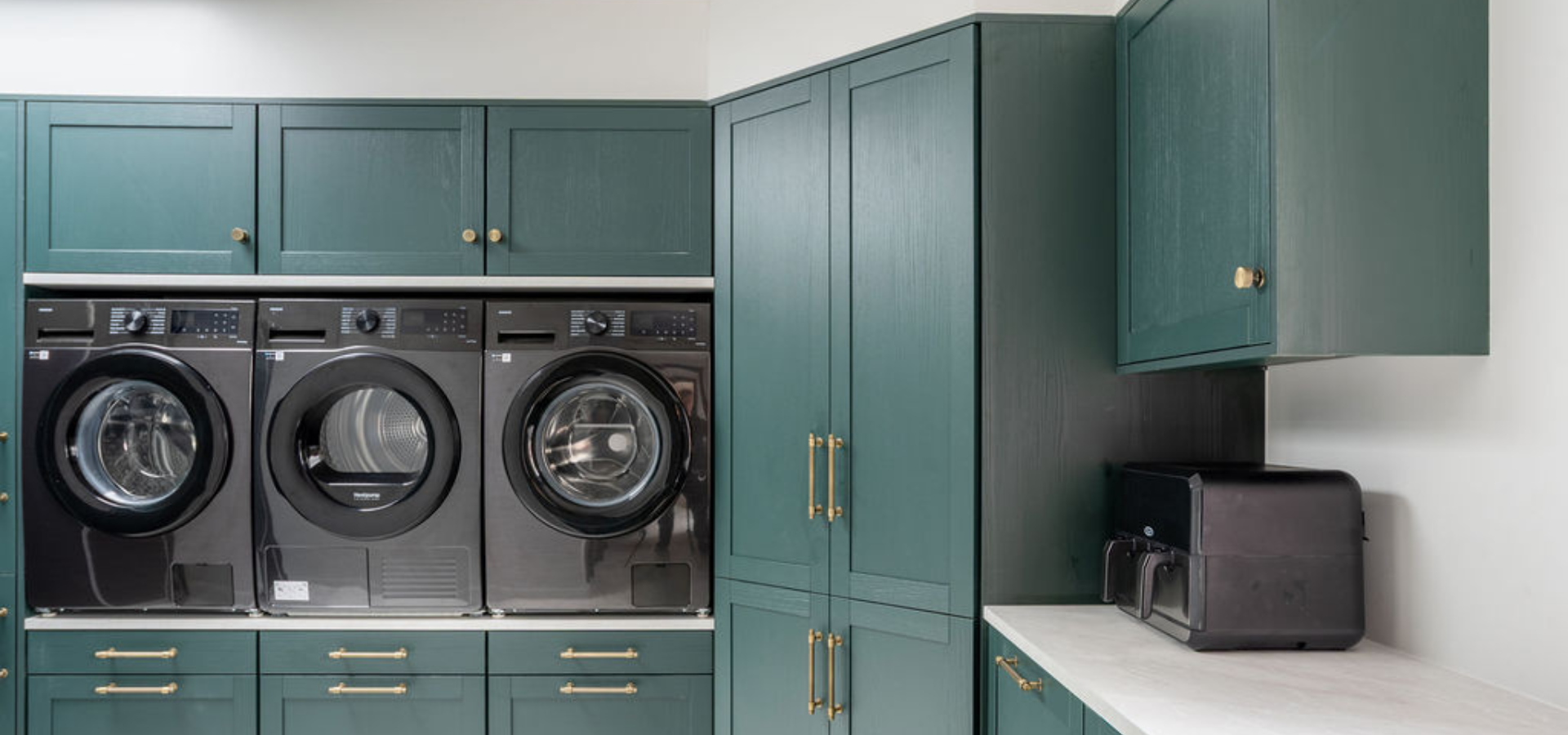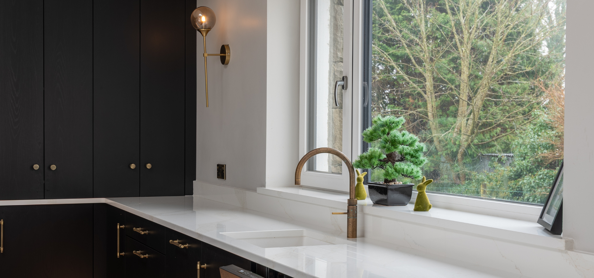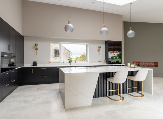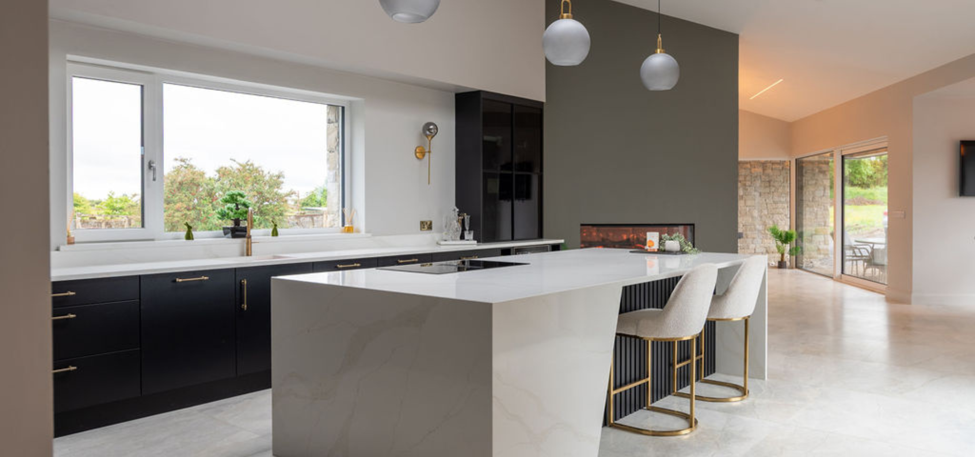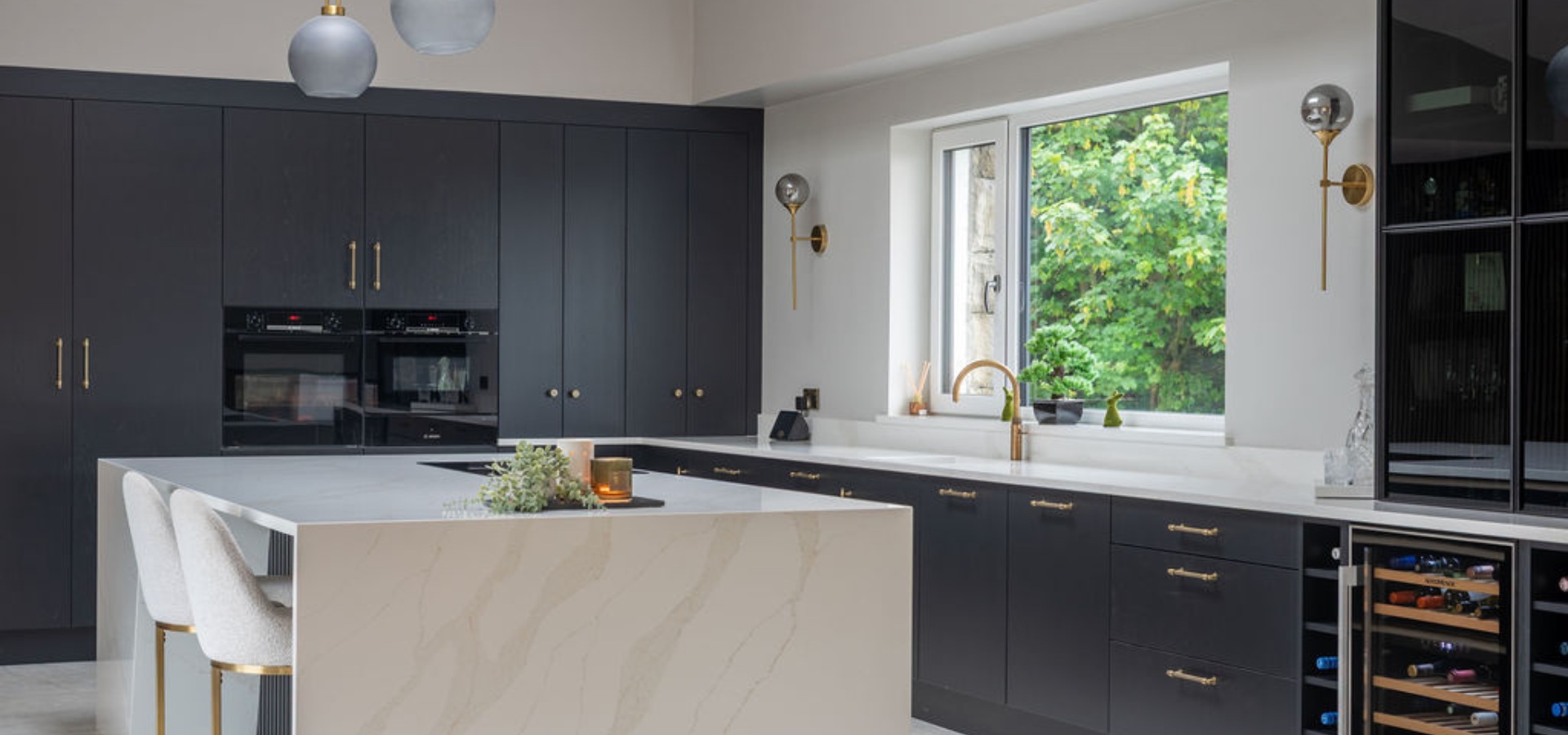 For this new build in County Mayo, Alan and Zara set out to create a bespoke contemporary kitchen that is striking, practical, and effortlessly clutter-free. Designed as the focal point of a large open-plan space, the kitchen combines a bold black palette with clean lines, integrated storage, and high-performance appliances – creating a layout that works effortlessly while keeping the space calm and organised.