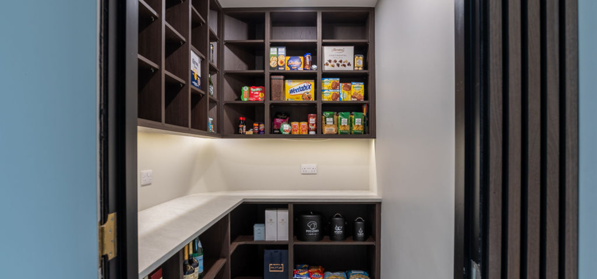 Every element in this contemporary kitchen is designed to create a calm, organised space where everything has its place. A walk-in pantry sits behind a curved slatted wall, while a double breakfast station with bi-fold doors keeps everyday items neatly out of sight.