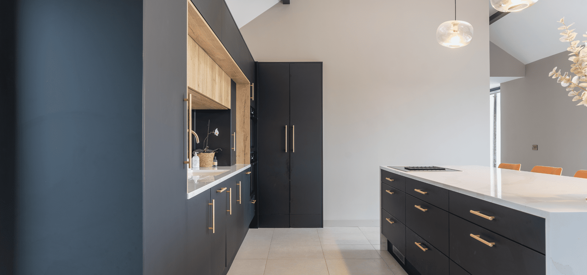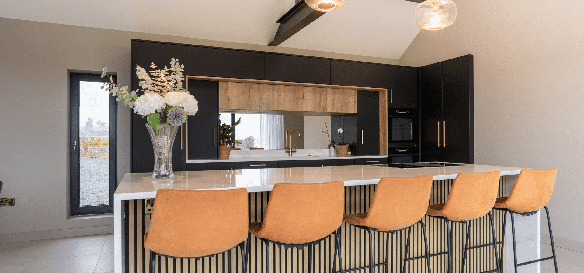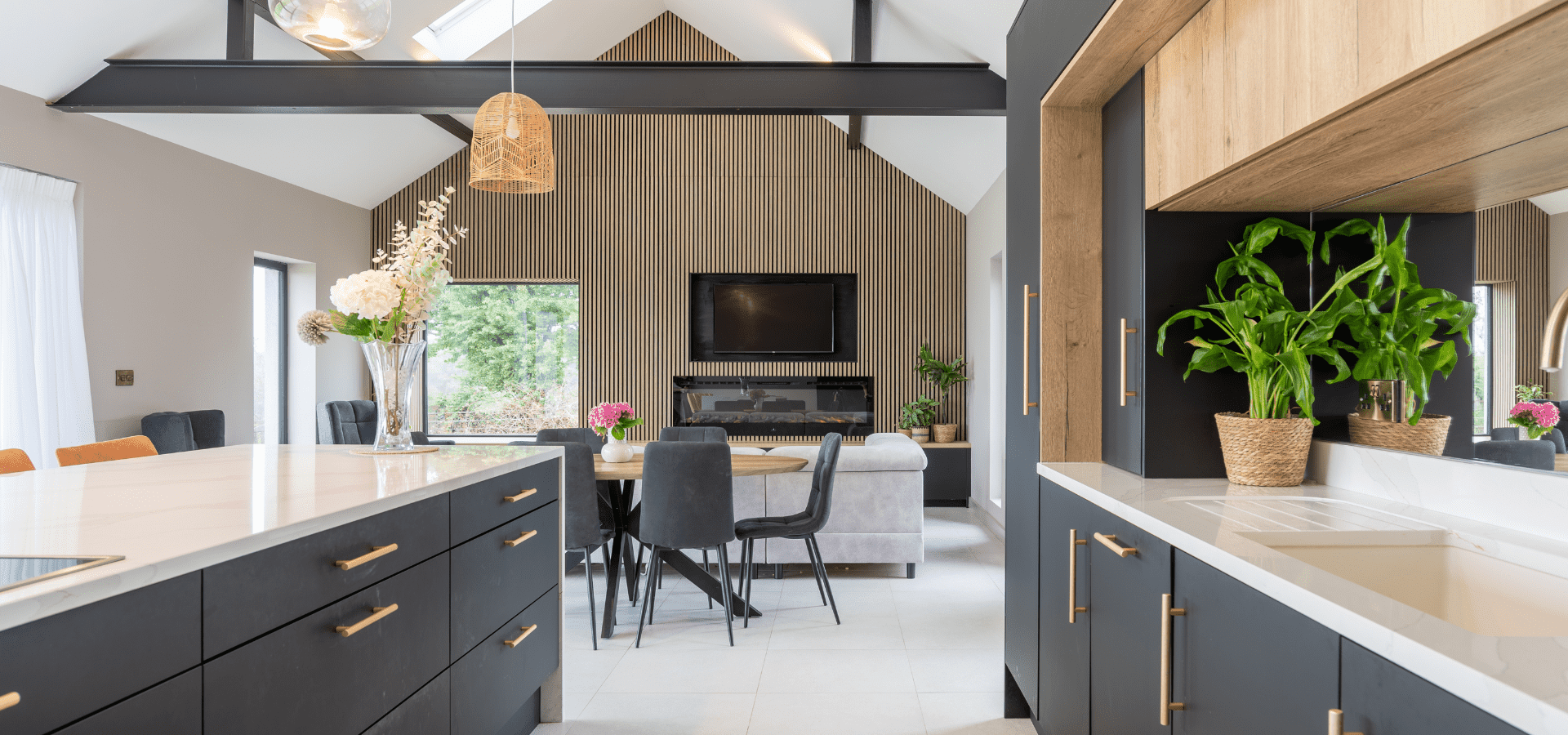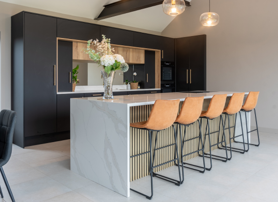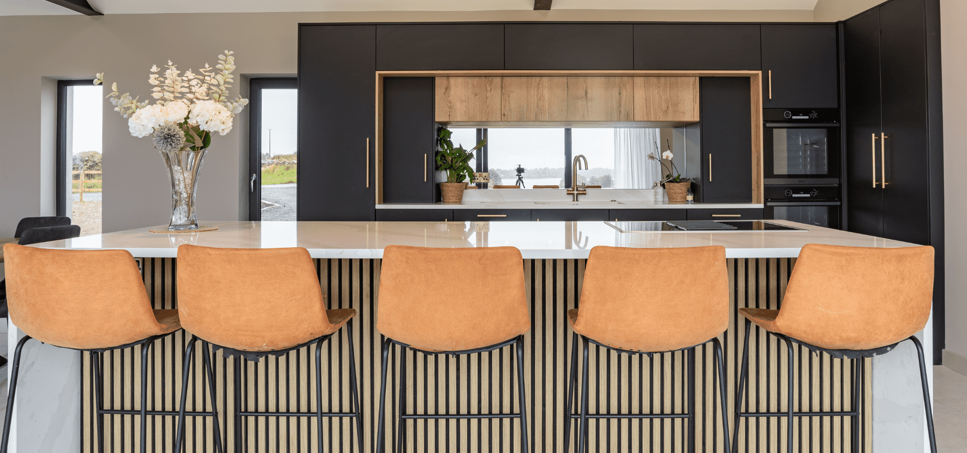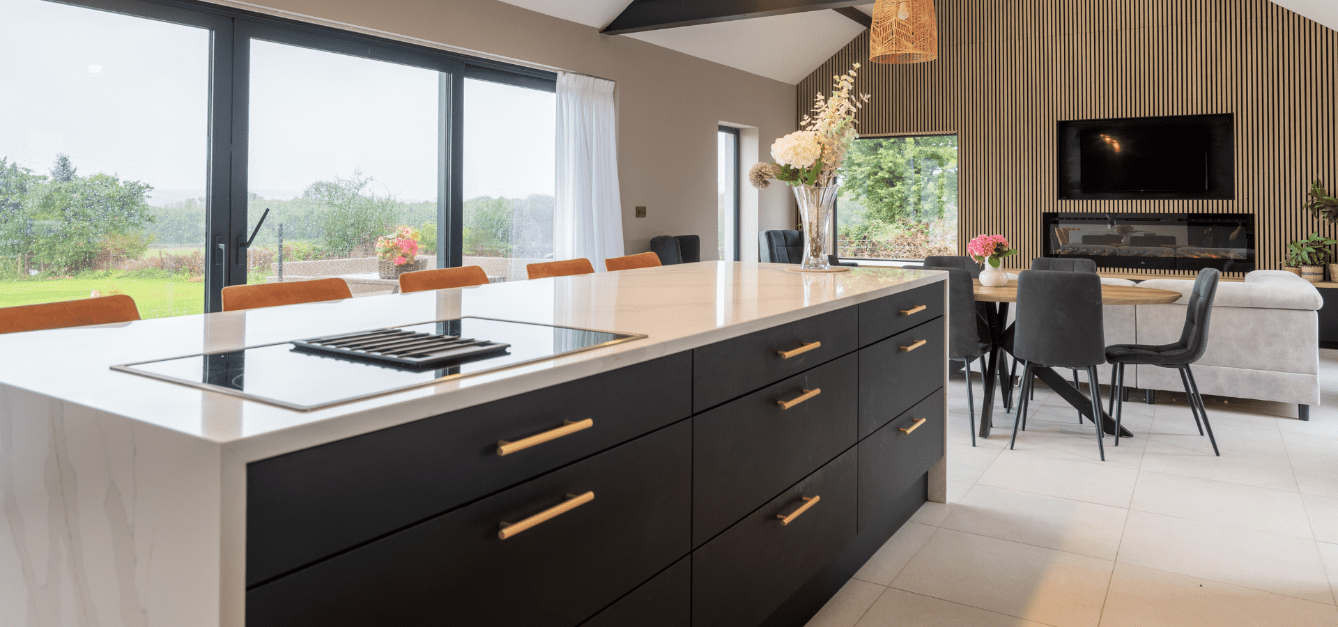 Matt black cabinetry is softened by Halifax Oak, with gold detailing adding a refined edge. Slatted oak panelling from the rear of the island continues into the living area, connecting to a full-length window seat in handleless Havana Black with a Halifax Oak top, creating a cohesive finish throughout.