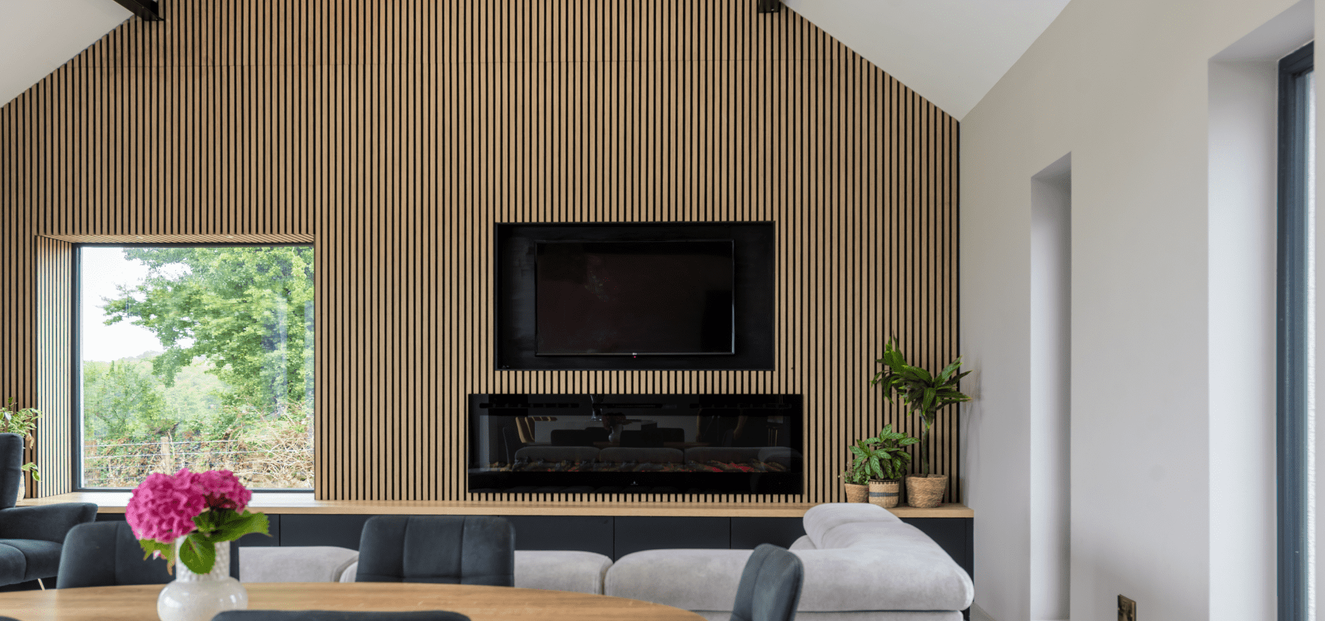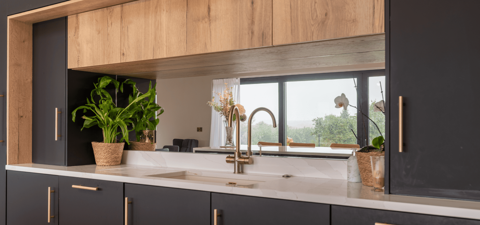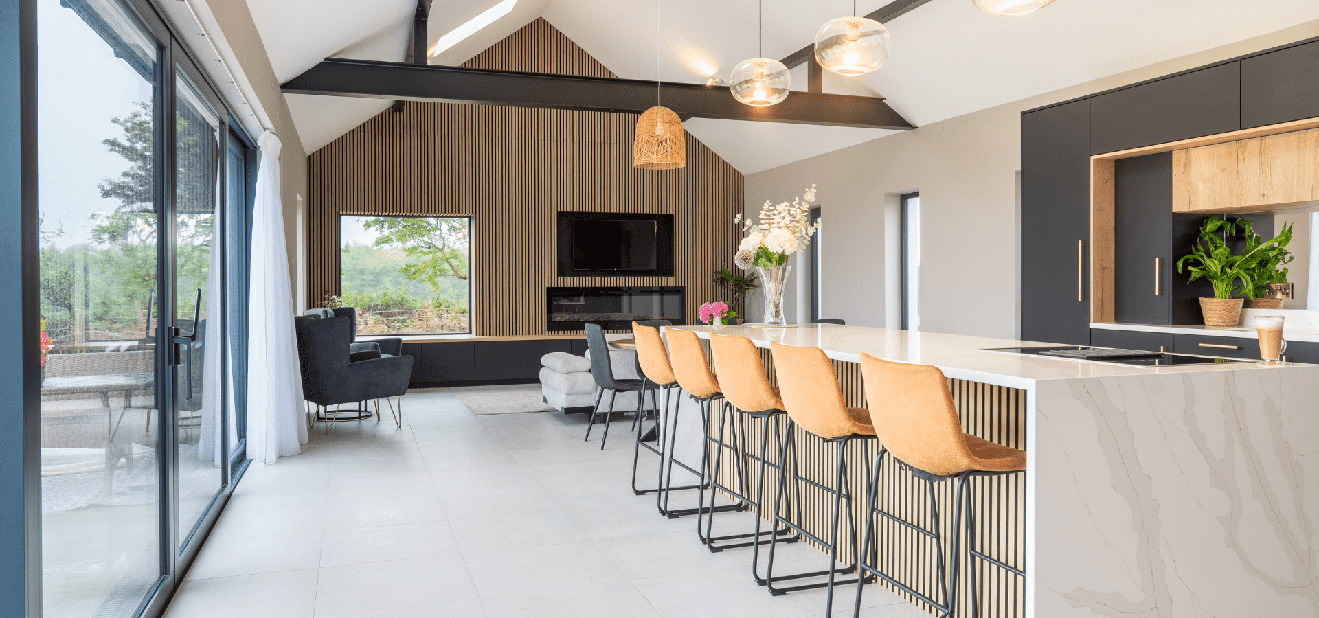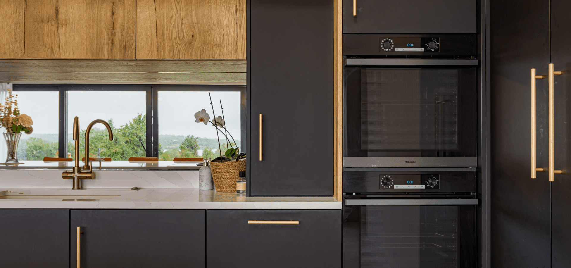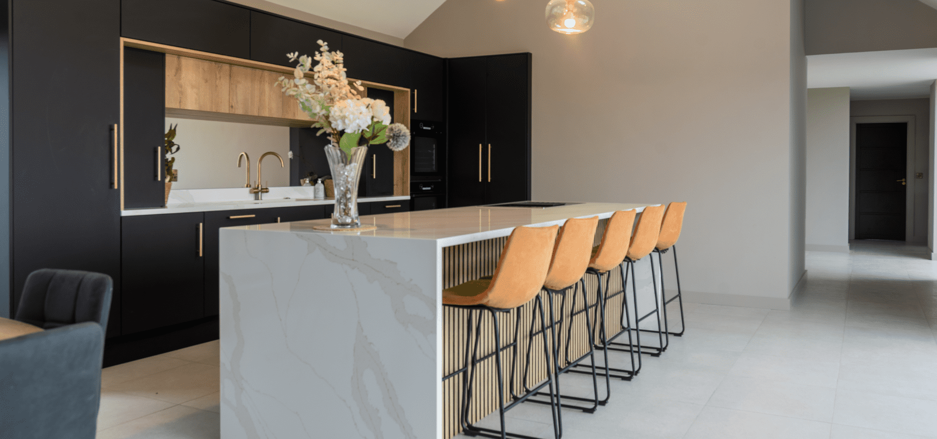 Matt black cabinetry is softened by Halifax Oak, with gold detailing adding a refined edge. Slatted oak panelling from the rear of the island continues into the living area, connecting to a full-length window seat in handleless Havana Black with a Halifax Oak top, creating a cohesive finish throughout.